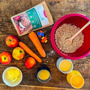 - Möhre und Äpfel reiben (gerne mit Schale) oder in einem Zerkleinerer klein häckseln.