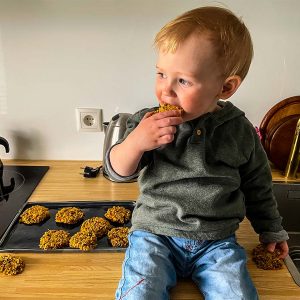 Wenn wir jetzt unterwegs sind und der kleine Mann einfach nicht mehr in den Kinderwagen, nicht mehr laufen oder im Auto sitzen will, dann kann ich ihn mit den Keksen noch ein wenig bei Laune halten – schließlich haben sich ein paar Schokodrops unter die Möhren- und Apfelraspel gemogelt ;).