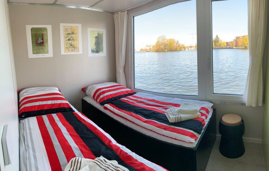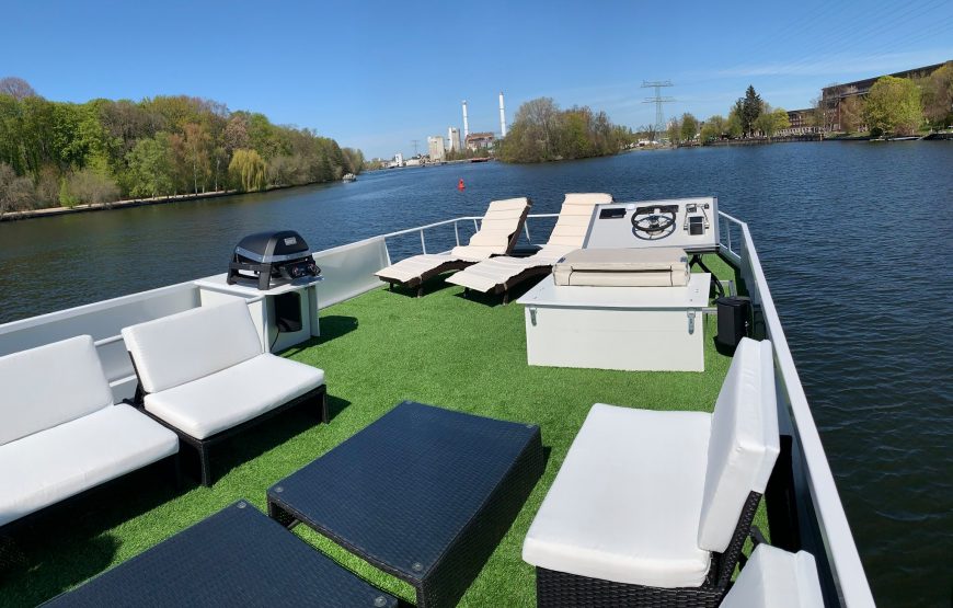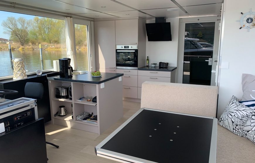 Für einen besonderen Anlass oder einen luxuriösen Urlaub dürfen wir euch das Premium-Hausboot vorstellen, das ihr mit einer Charterbescheinigung (sofern kein Bootsführerschein vorhanden ist) entspannt durch die Havellandschaft schippern dürft. Hier haust ihr zu max. 5 Personen äußerst komfortabel wie in einer top ausgestatteten Wohnung, nur eben auf dem Wasser: eine großzügige Wohnebene mit zwei separaten Kabinen, zwei Badezimmern, eine voll ausgestattete Küche und der Salon mit Panoramafenstern machen euer Abenteuer äußerst bequem und wohnlich. Das Sahnehäubchen ist neben der Bugterrasse das 26qm große Sonnendeck, wo ihr die Landschaft in vollen Zügen aufsaugen könnt.