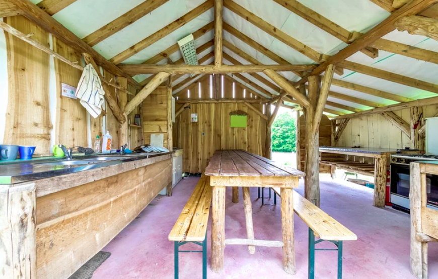 So bietet auch die kleine, aber sehr pfiffige Holzhütte in besonderer Optik alles, was ihr in eurem naturverbundenen Abenteuerurlaub mit Komfortfaktor benötigt: hier findet ihr einen Essbereich für 4 Personen, private Trockentoiletten am Waldrand und Strom. Ein Doppelbett befindet sich gemütlich in einer Nische, zwei weitere Einzelbetten im Wohnbereich. Die Sanitärhäuschen, der Küchenbereich und die natürlichen Spielmöglichkeiten für Kinder auf dem Campingplatz dürfen natürlich mitbenutzt werden. Ein Frühstückskorb wird euch zu eurer Hütte gebracht.